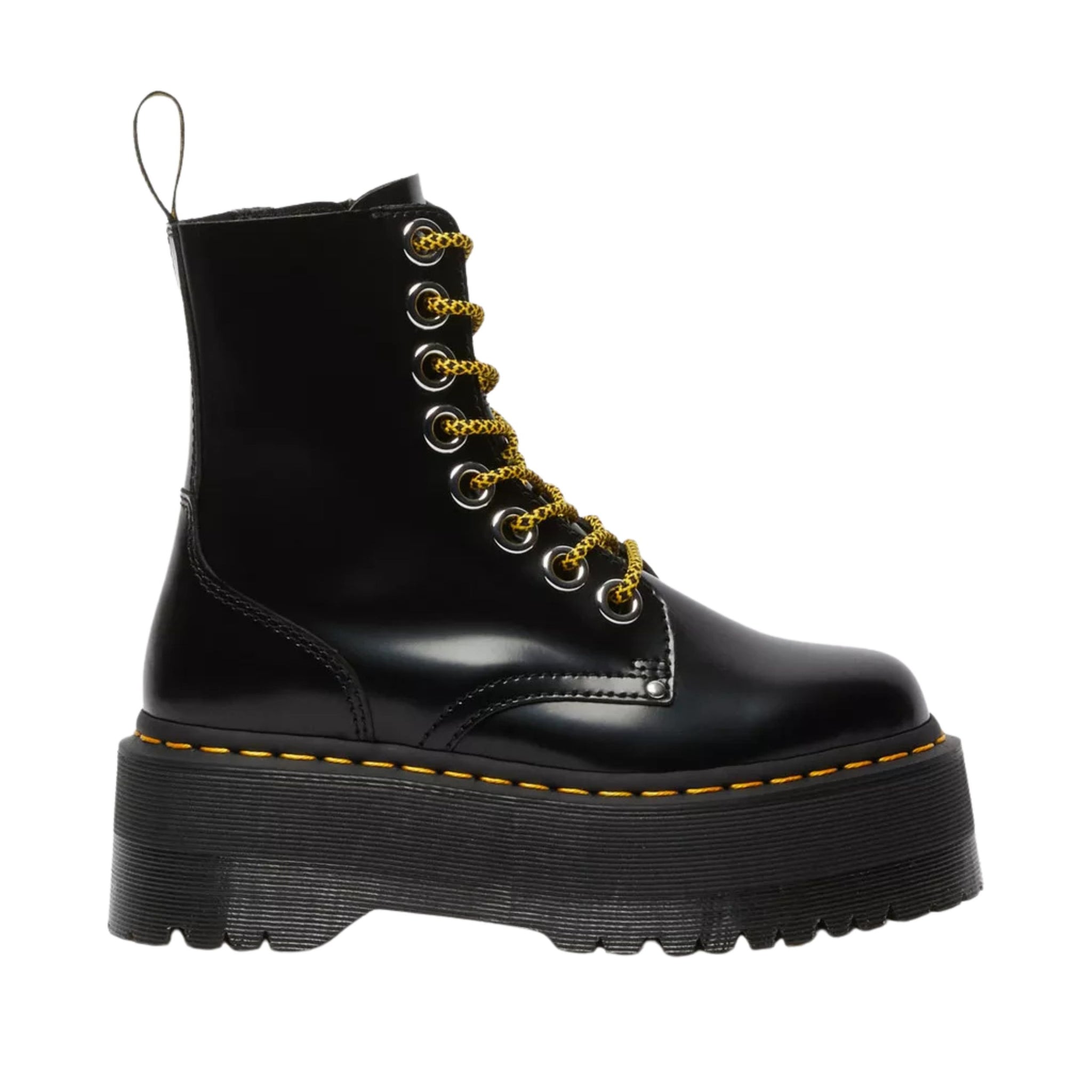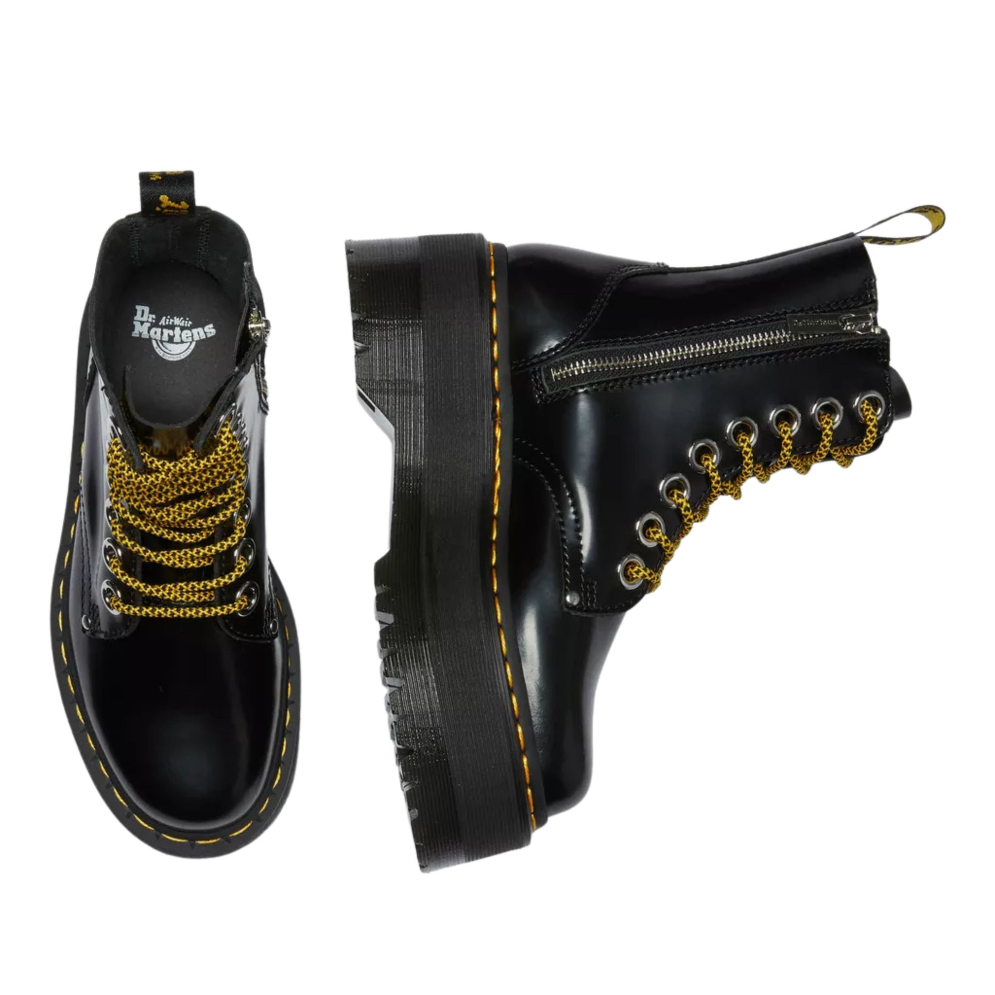 È arrivato il nostro platform più alto ed eccentrico. Con una suola Quad Max di 6 cm realizzata per far sentire chi le indossa come in cima al mondo. Versione aggiornata e a tutto volume della nostra silhouette culto Jadon, questi stivali sono caratterizzati da occhielli oversize e lacci dalle estremità metalliche. Sono inoltre forniti di una pratica zip centrale per agevolare la calzata, eccezionali lacci giraffati e tutto il classico DNA Dr. Martens.