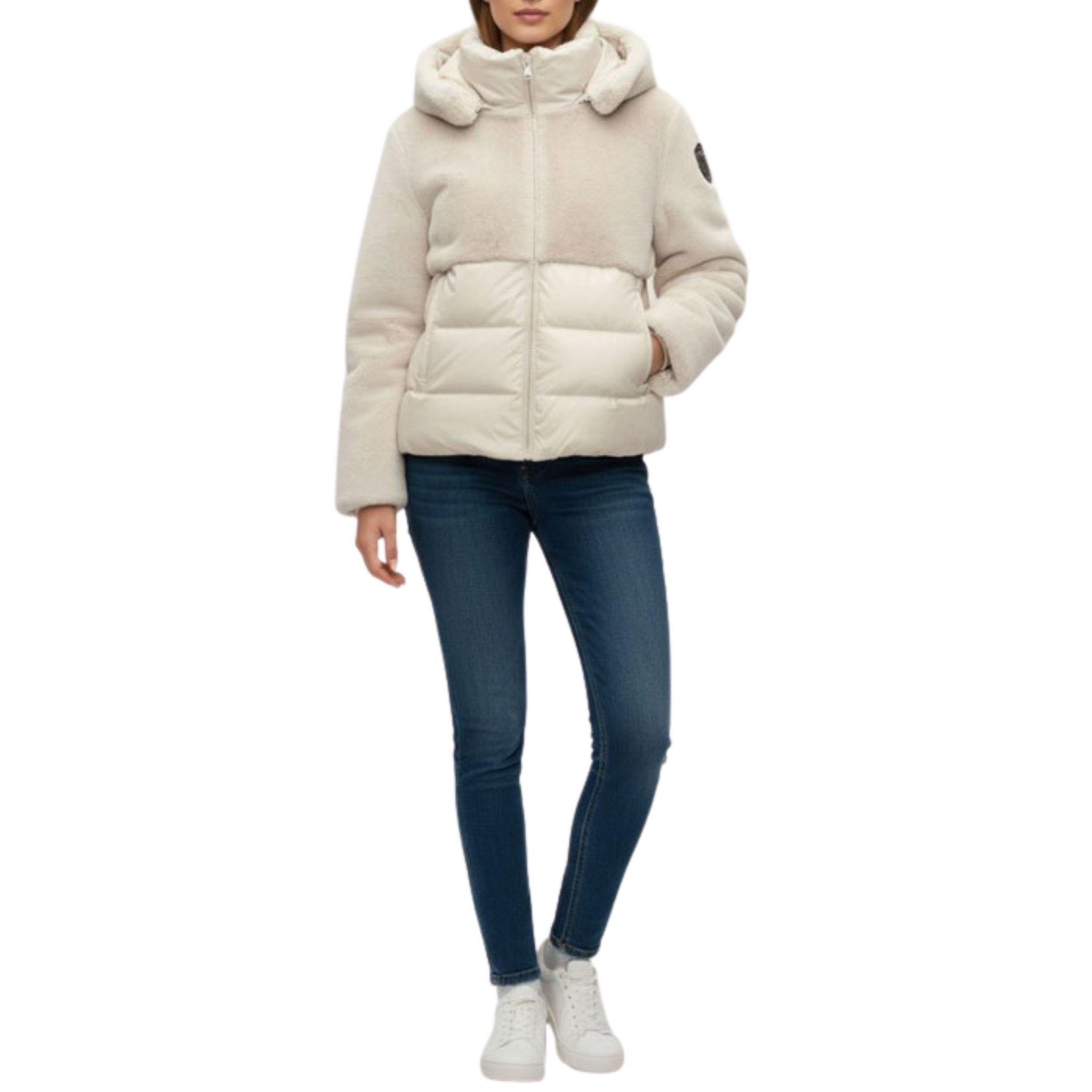 Giubbetto in ecopelliccia nella parte superiore e in nylon lucido nella parte inferiore. Caldo cappuccio ed impuntura sotto a righe orizzontali; capo pensato per proteggere dagli inverni più rigidi senza rinunciare allo stile.