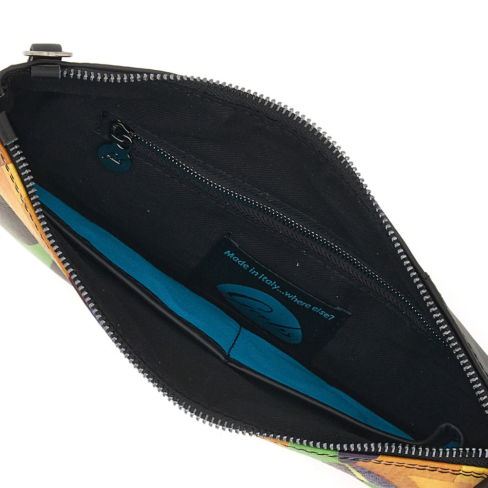 Pochette BEYONCE foderata in cotone, con tasche interne aperte e con zip e tracolla regolabile e removibile in dotazione. Icon Basic: l'inconfondibile Linea di Gabs che presenta il classico bottone turchese, le cuciture azzurre e la tracolla nastro rigato.