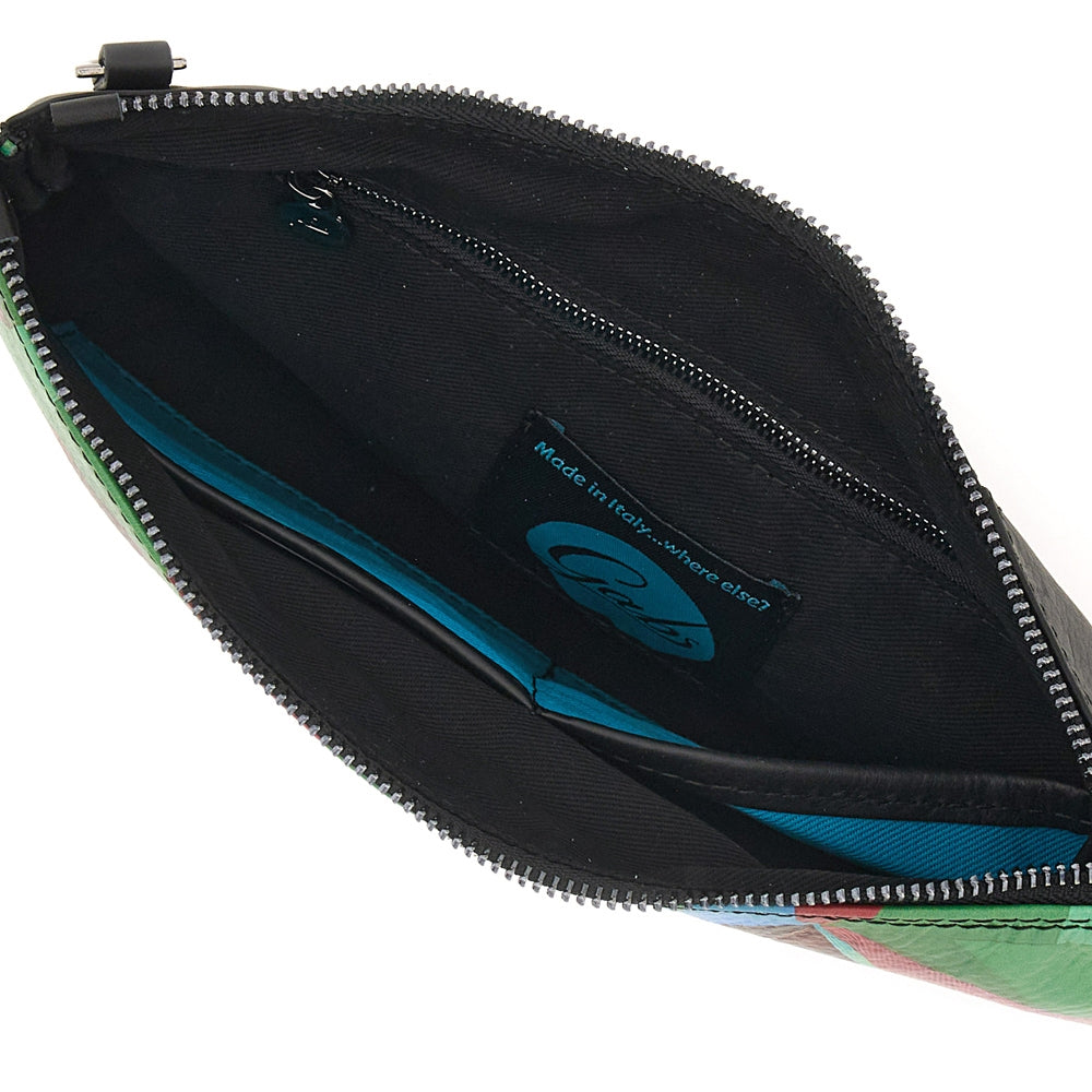 Pochette BEYONCE foderata in cotone, con tasche interne aperte e con zip e tracolla regolabile e removibile in dotazione. Icon Basic: l'inconfondibile Linea di Gabs che presenta il classico bottone turchese, le cuciture azzurre e la tracolla nastro rigato.