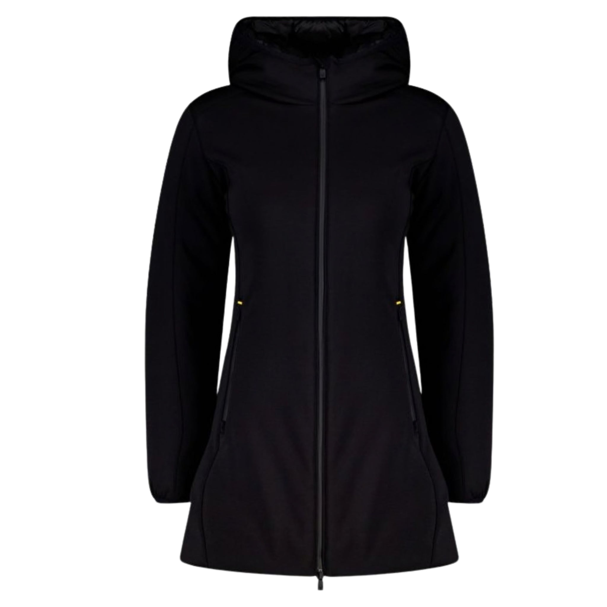 Giacca softshell donna invernale lunga nera con cappuccio, imbottita in ecodown.
