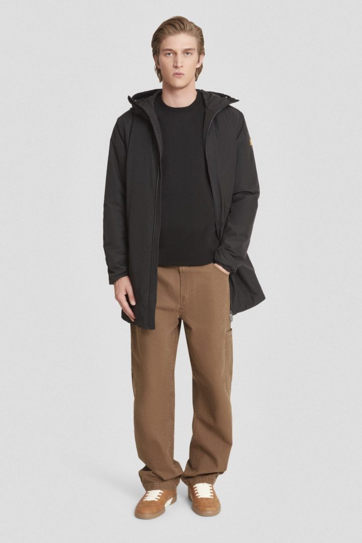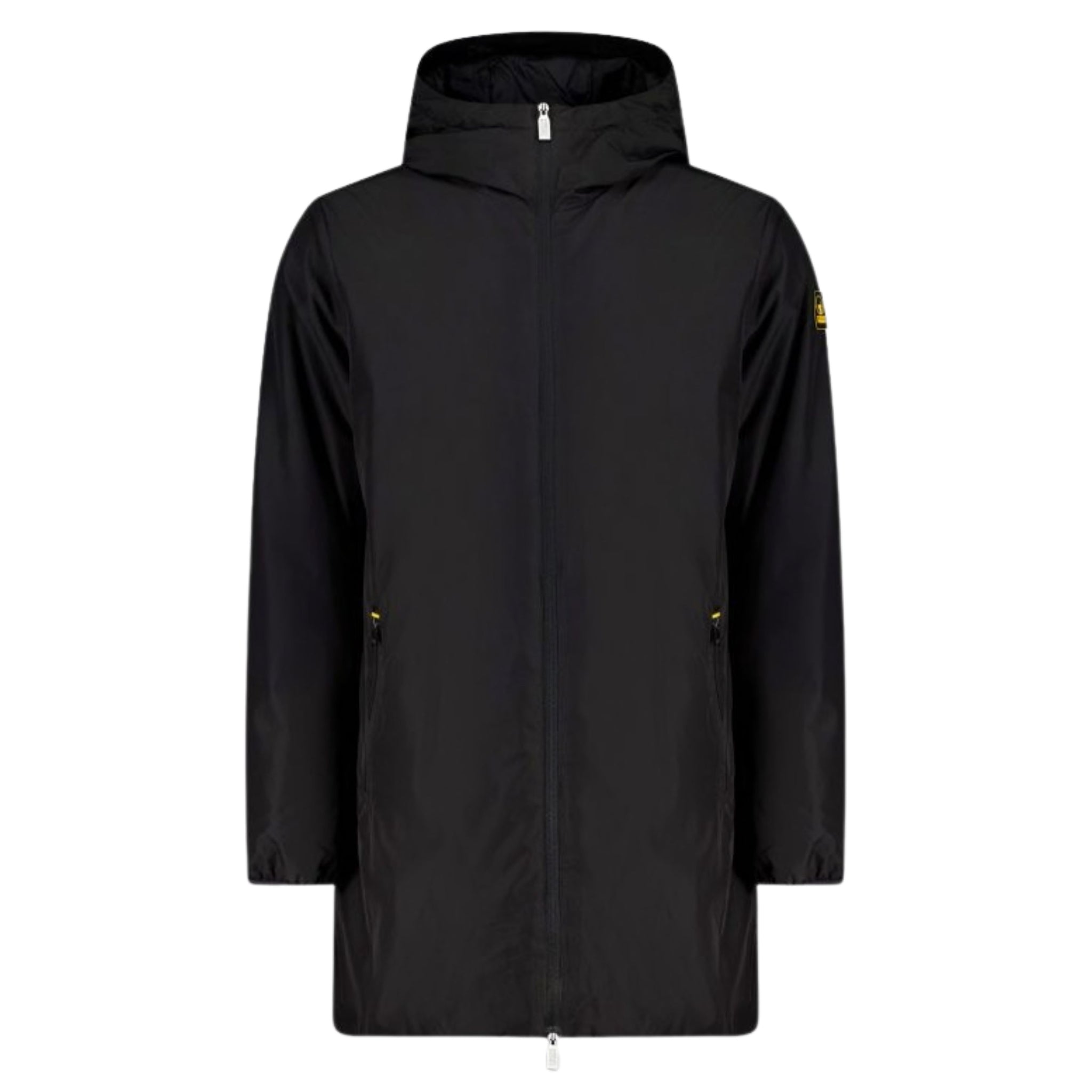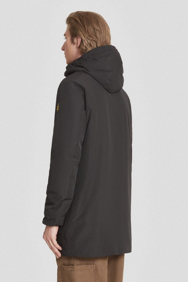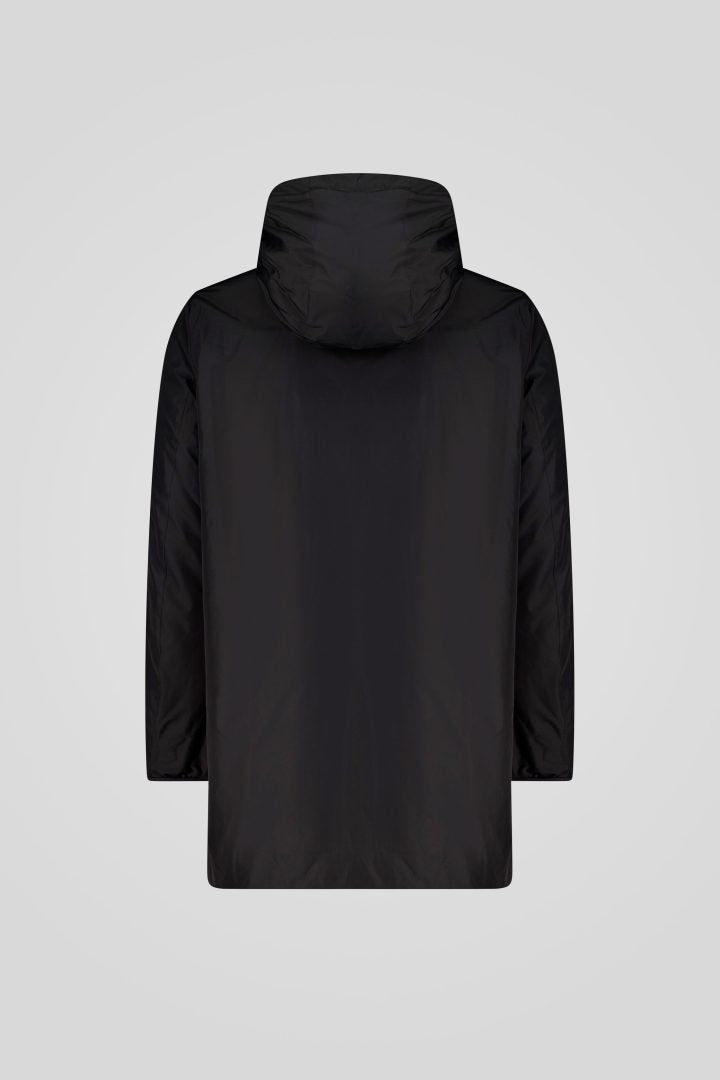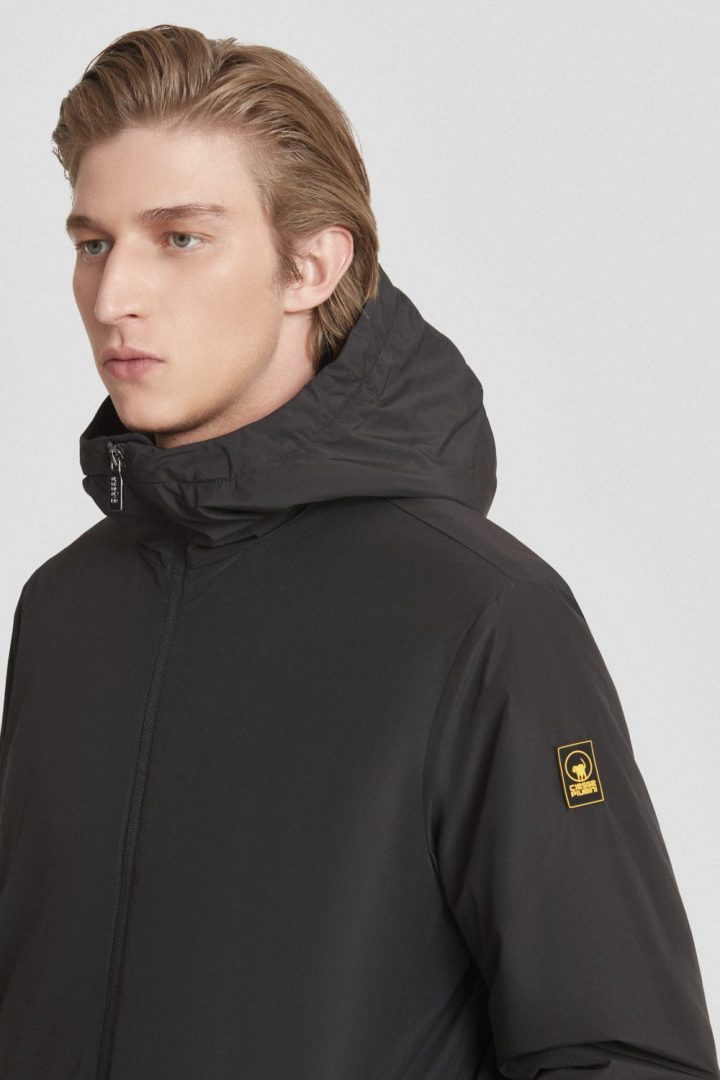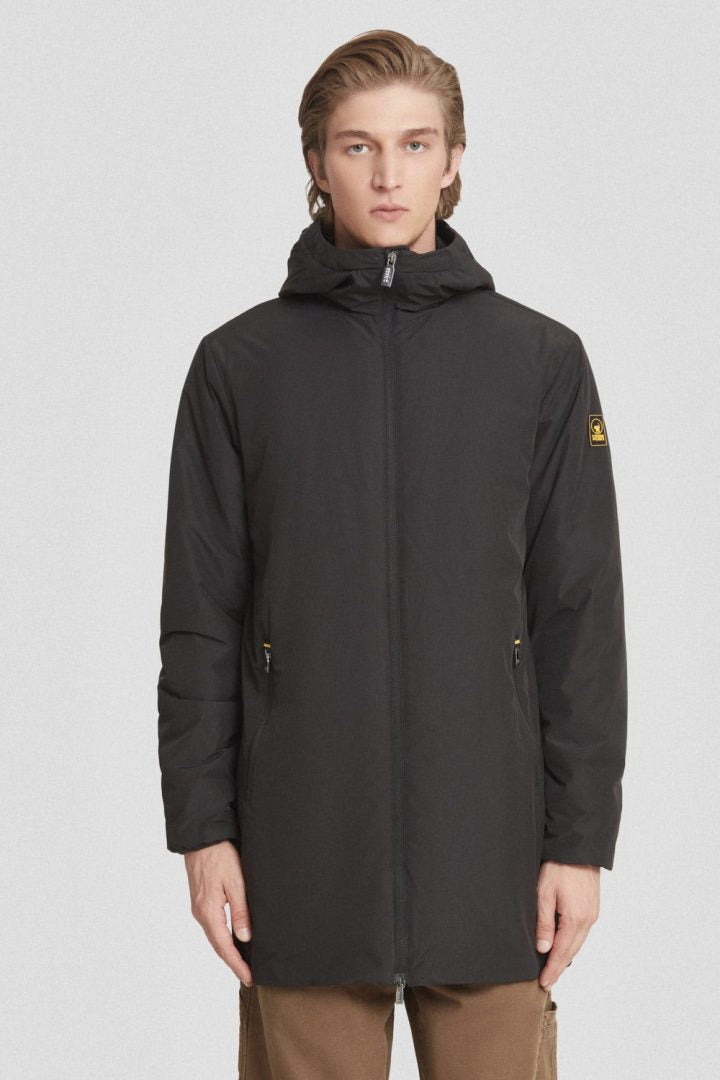 Giacca lunga nera uomo imbottita con cappuccio, ideale dalla città alla natura, dall’autunno alla primavera. L’imbottitura in ovatta 80gr garantisce comfort e calore, mentre il tessuto poly taslan è trattato DWR per offrire protezione dagli agenti atmosferici.