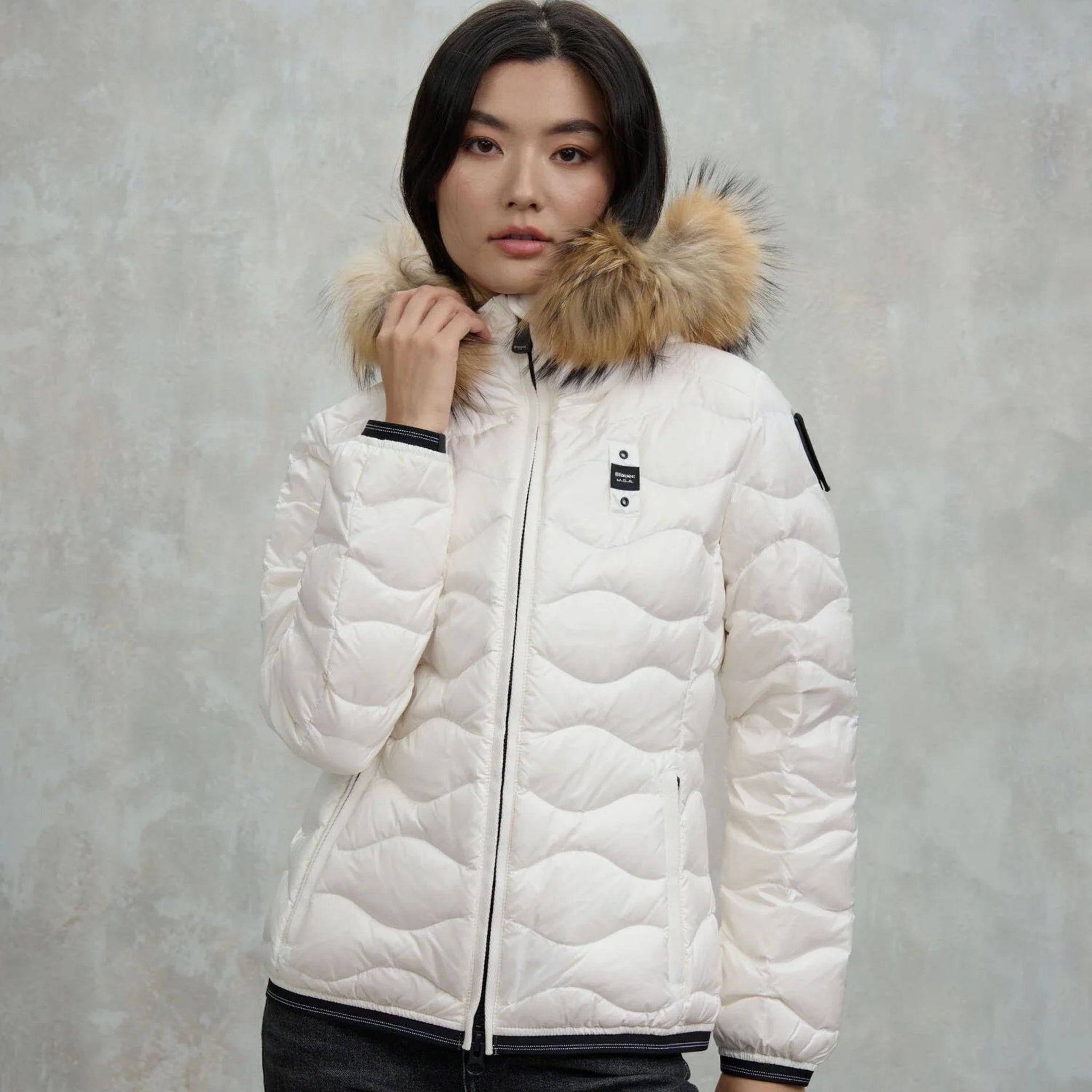 Blauer Piumino Corto Aldie Bianco Ottico Donna con Cappuccio con Pelliccia