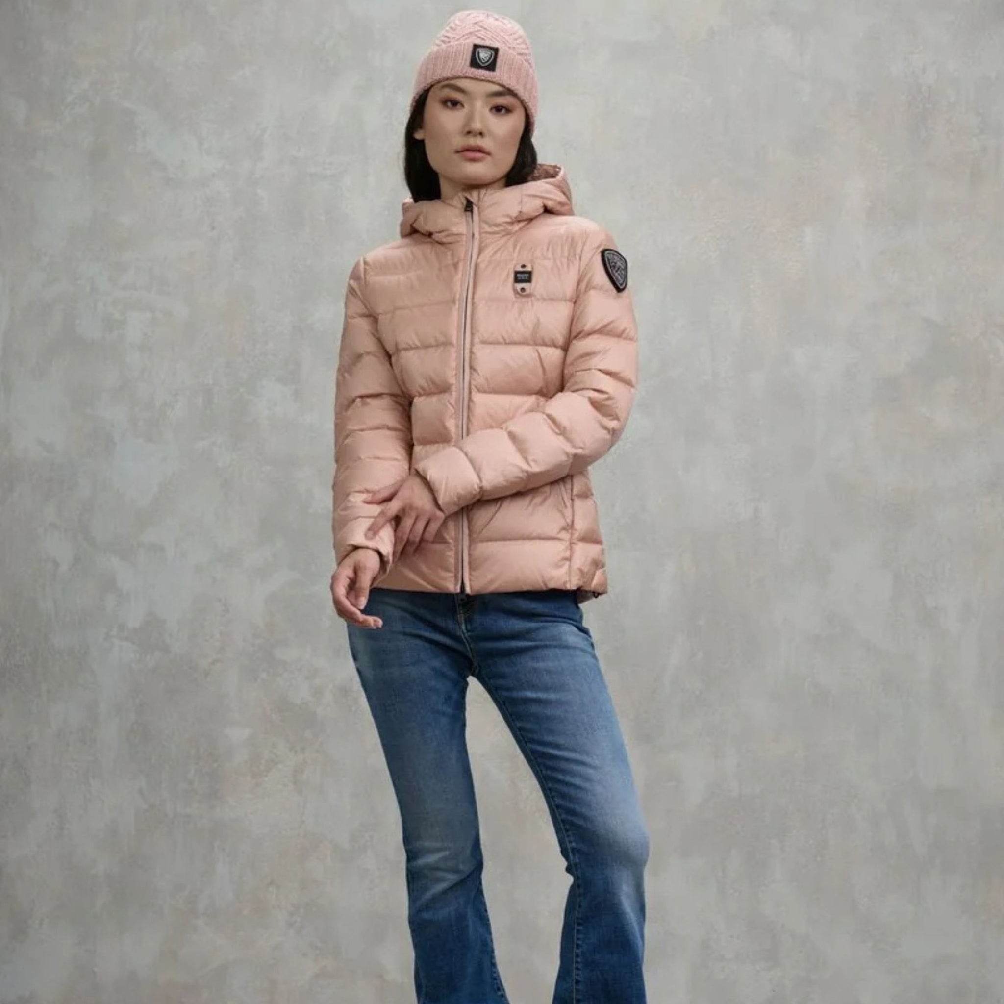 Blauer Piumino Sfiancato Charme Rosa Interno Grigio Donna con Cappuccio Fisso