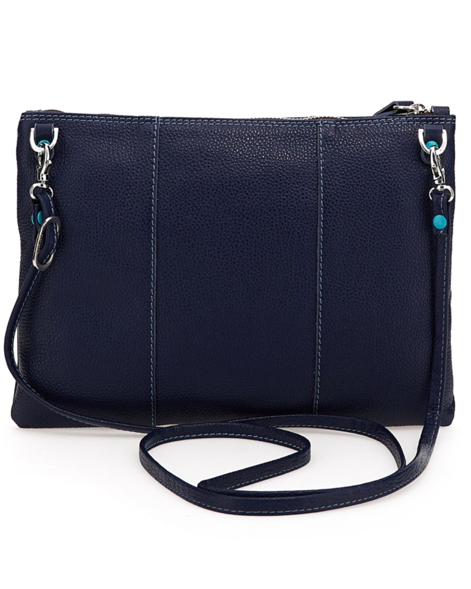 BEYONCE clutch bag lined in cotton, with internal open pockets and zip and adjustable and removable shoulder strap included. Icon Basic: the unmistakable Gabs line that features the classic turquoise button, light blue stitching and the striped ribbon shoulder strap.