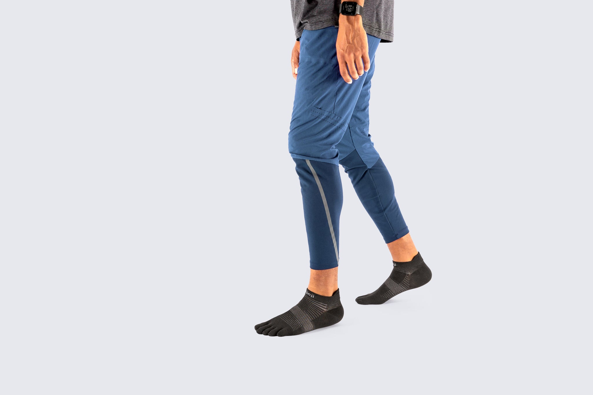 Calze Injinji Run Lightweight No-Show, un modello a cinque dita specificamente progettato per la corsa. Le principali caratteristiche di queste calze sono la leggerezza e la vestibilità a scomparsa, ideale per chi cerca una protezione minima dalle vesciche senza aggiungere volume al piede.