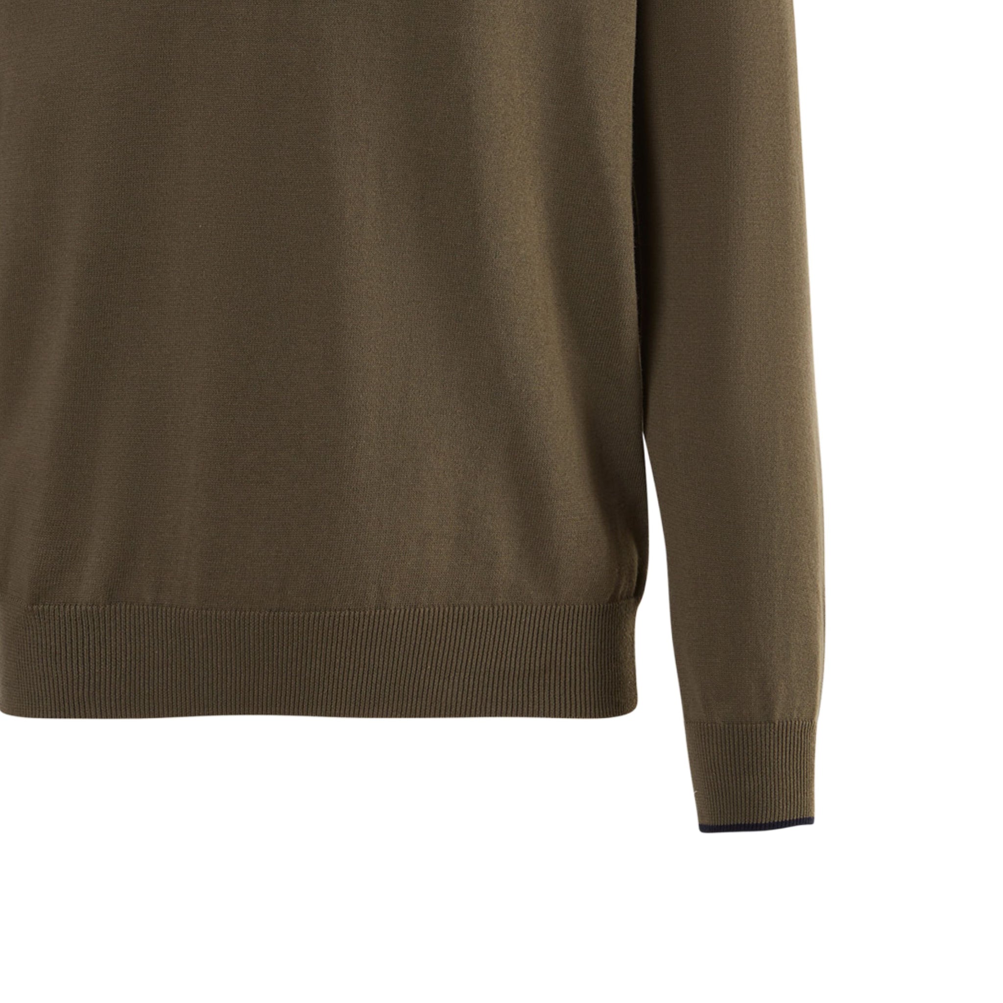 Girocollo realizzato in cotone eco sporty, finezza 12. Doppio collo con righe a contrasto e ricamo tonale.