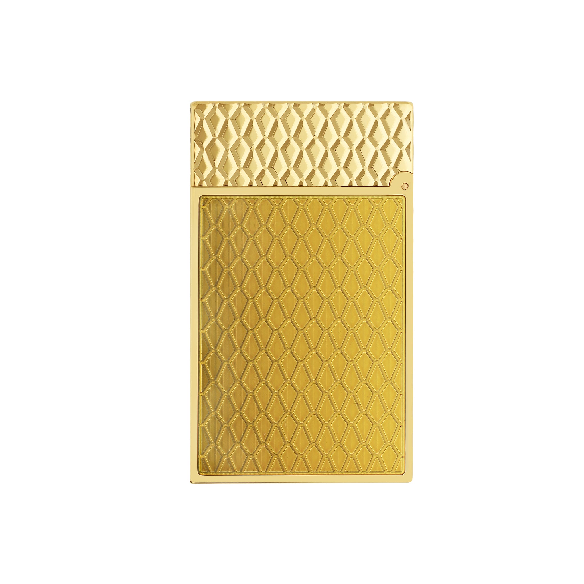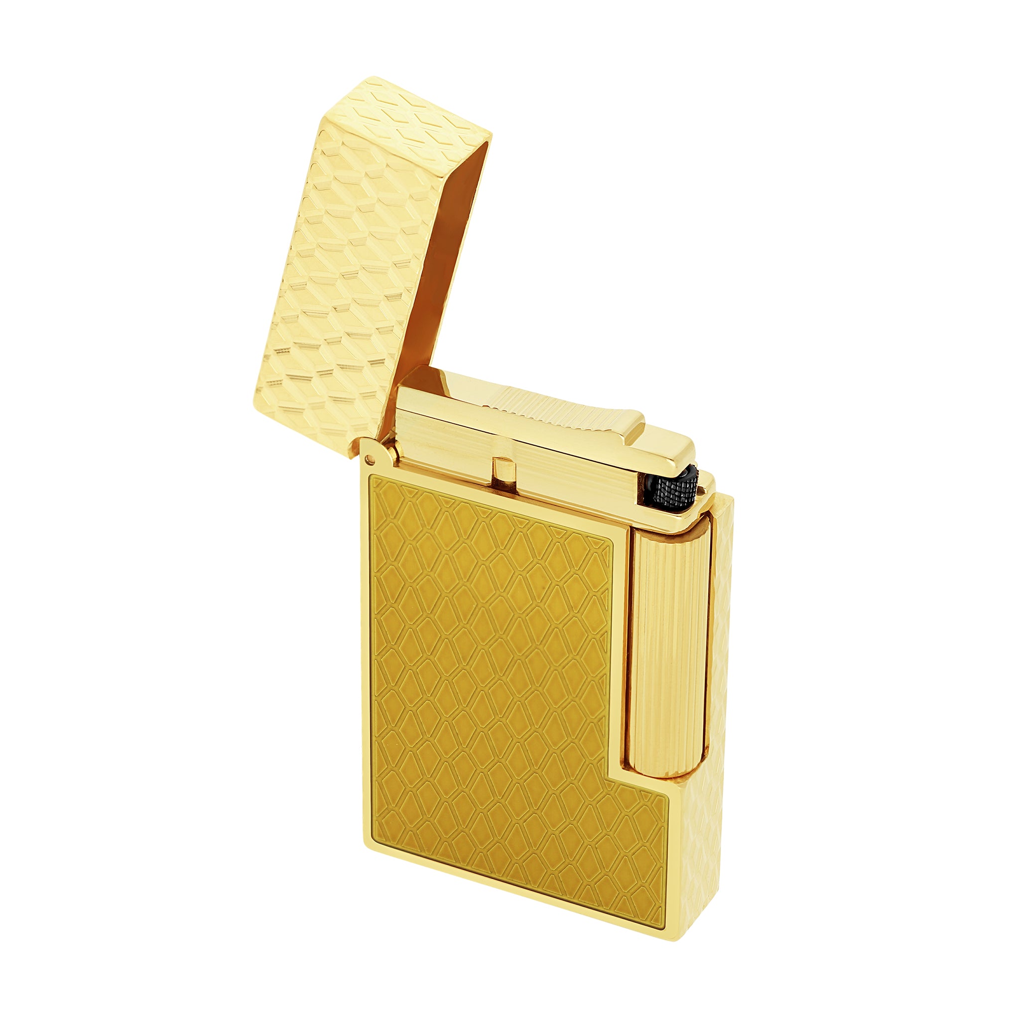 La Linea 2 è ornata da un coperchio orafo a guilloché squame di drago e finiture dorate, così come un corpo a guilloché sotto lacca Dupont di colore miele.