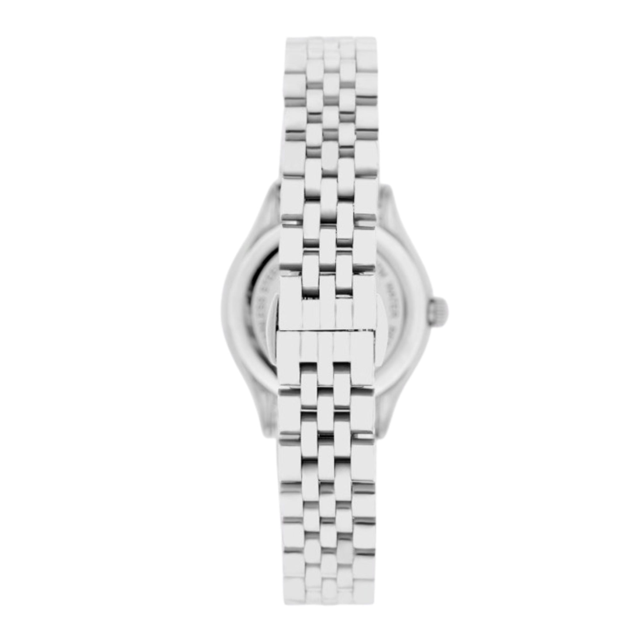 Quadrante silver con ghiera impreziosita da cristalli taglio baguette sulla ghiera.