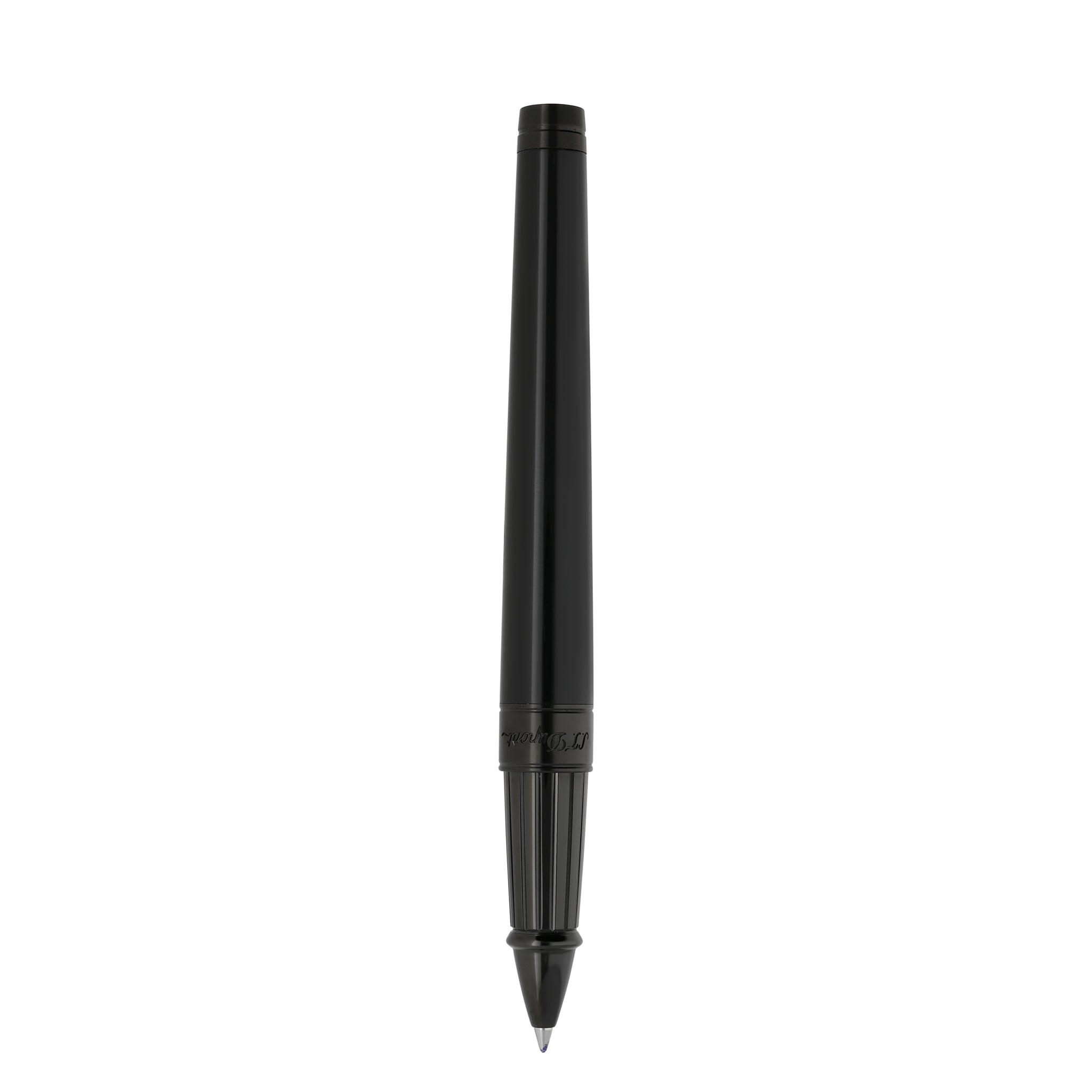 Grande penna a rotelle Line D Eternity in lacca nera lucida Dupont con finiture in nero satinato. Il cappuccio è decorato con il motivo Memento Mori. Prodotto nei nostri laboratori a Faverges, Francia. Ricariche associate: 040840 Blu - 040841 Nero.