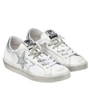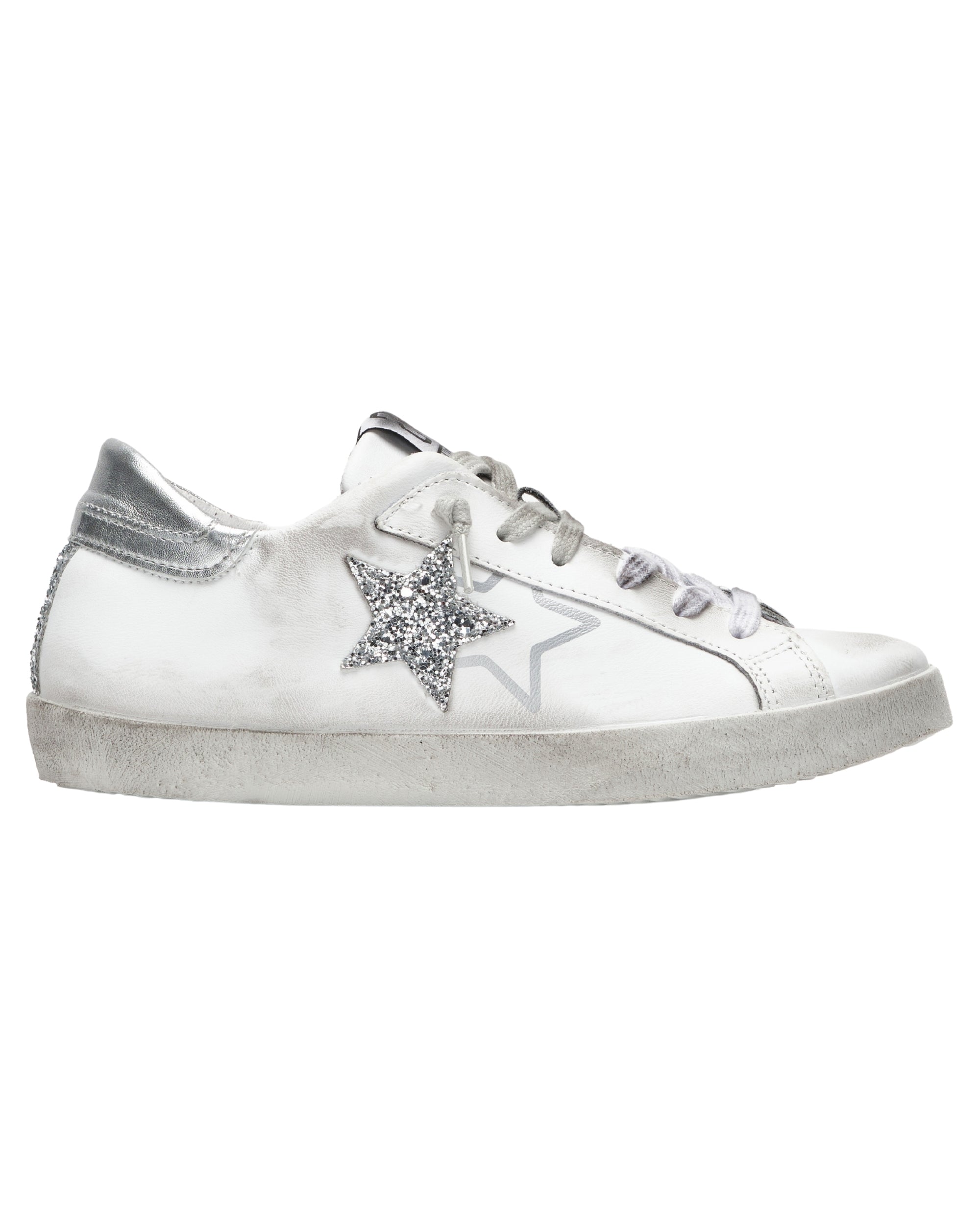 2Star Scarpe Sneakers Made in Italy artigianali One Star Pelle con Glitter Argento Bianco 4205